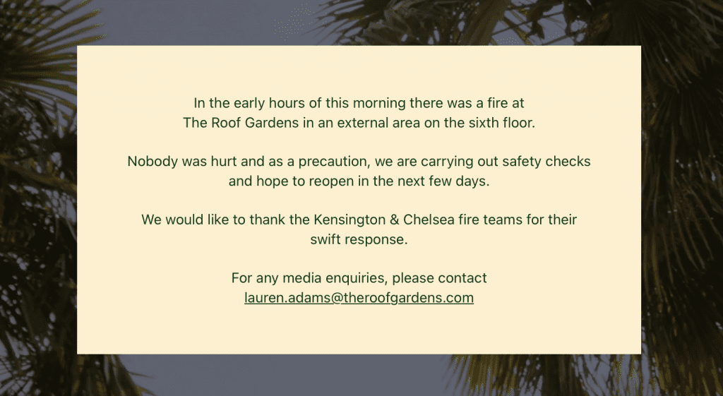 An official statement from The Roof Gardens has been posted on its website…