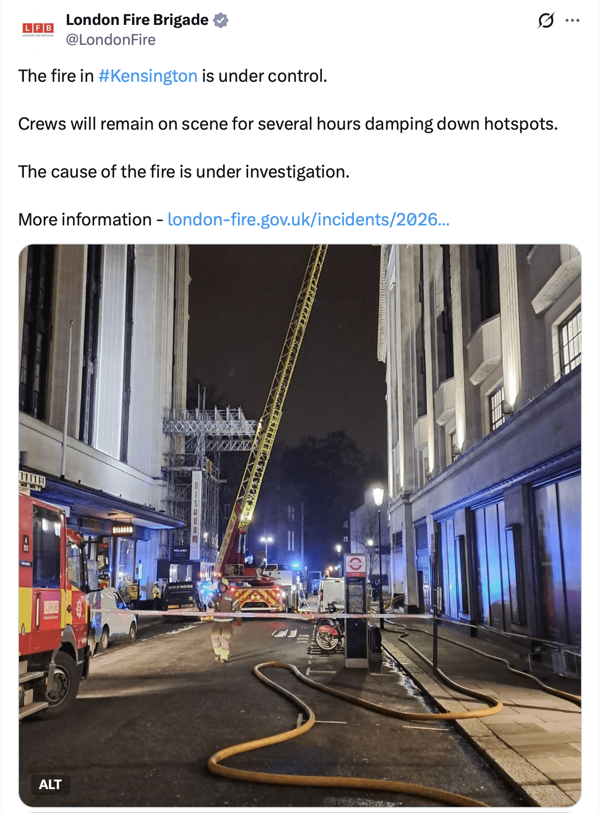 This morning, fire engines remained parked along High Street Kensington, hoses still attached to hydrants and stretched across pavements as crews secured the building and carried out final checks.