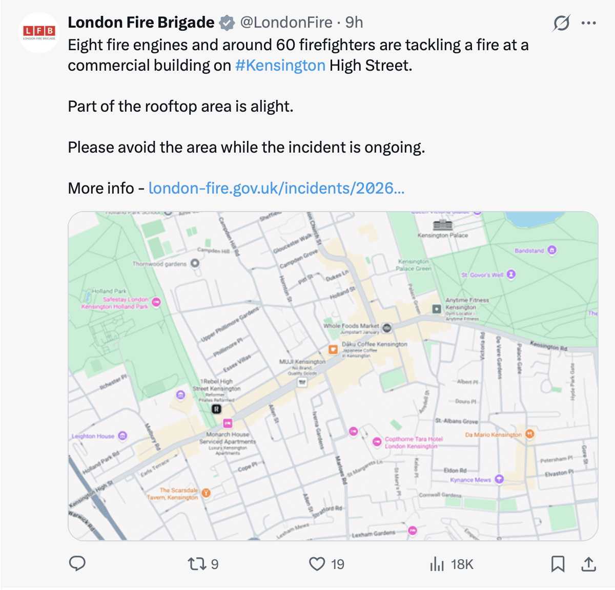 An LFB spokesperson said: “Twelve fire engines and around 80 firefighters tackled a fire at a commercial building on Kensington High Street in Kensington.