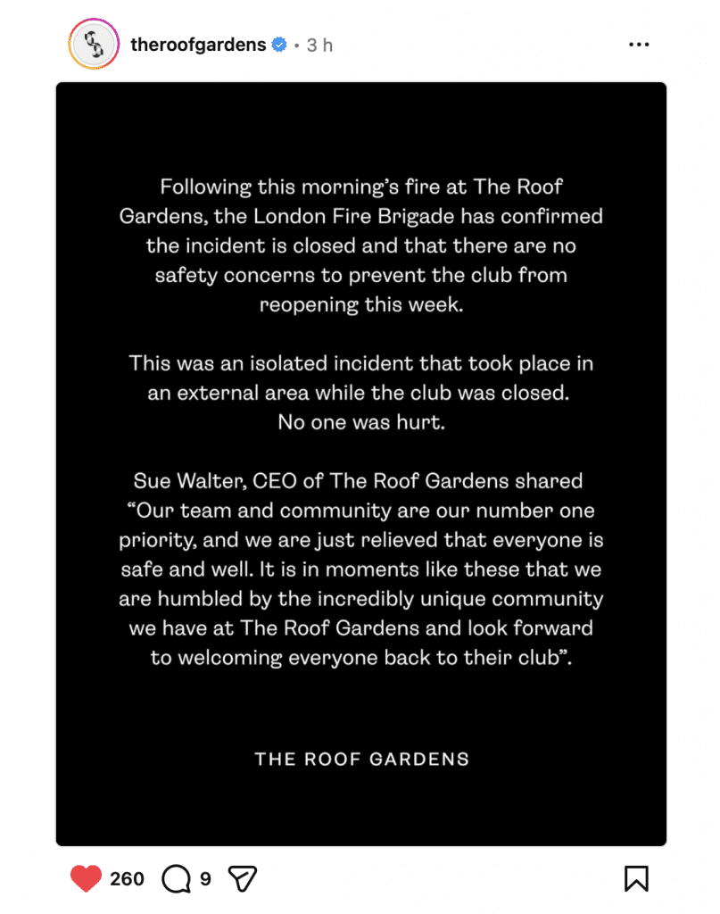 Around 6pm today, The Roof Gardens announced that the club is fit to re-open. Great news…