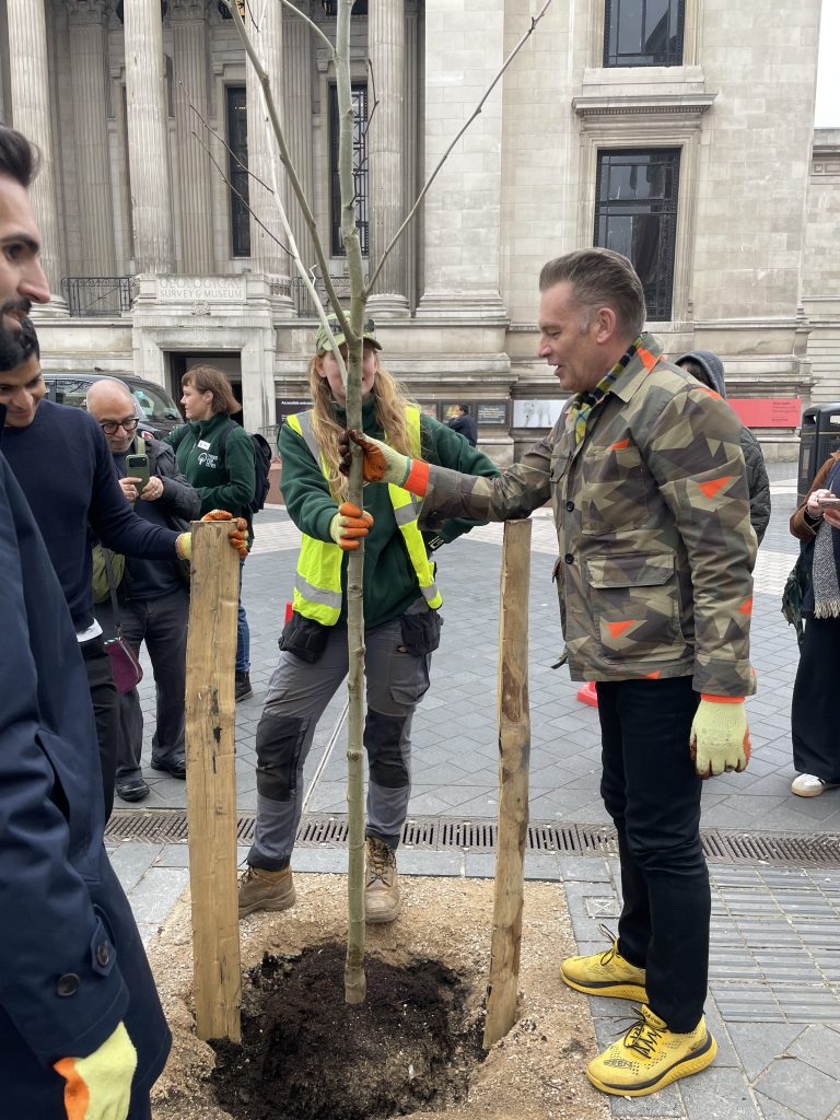 TV wildlife star and proud “tree hugger” Chris Packham popped into SW7 today to help plant the two-millionth tree for urban charity Trees for Cities.