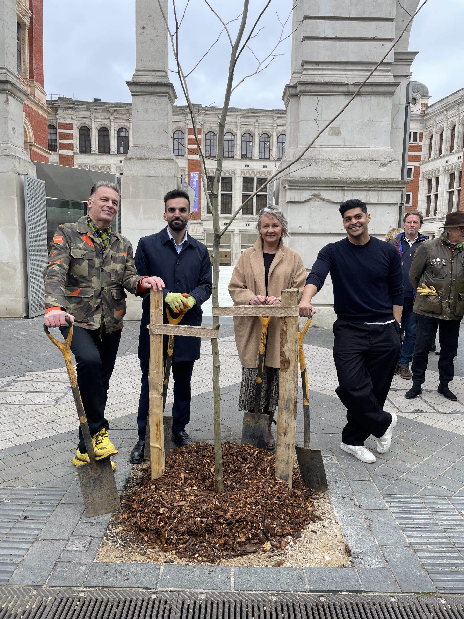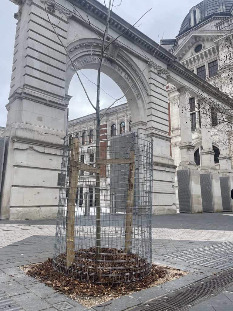 The young London plane sapling now stands on blustery Exhibition Road outside the world-famous Victoria & Albert Museum — replacing a tree that was knocked down by a car.