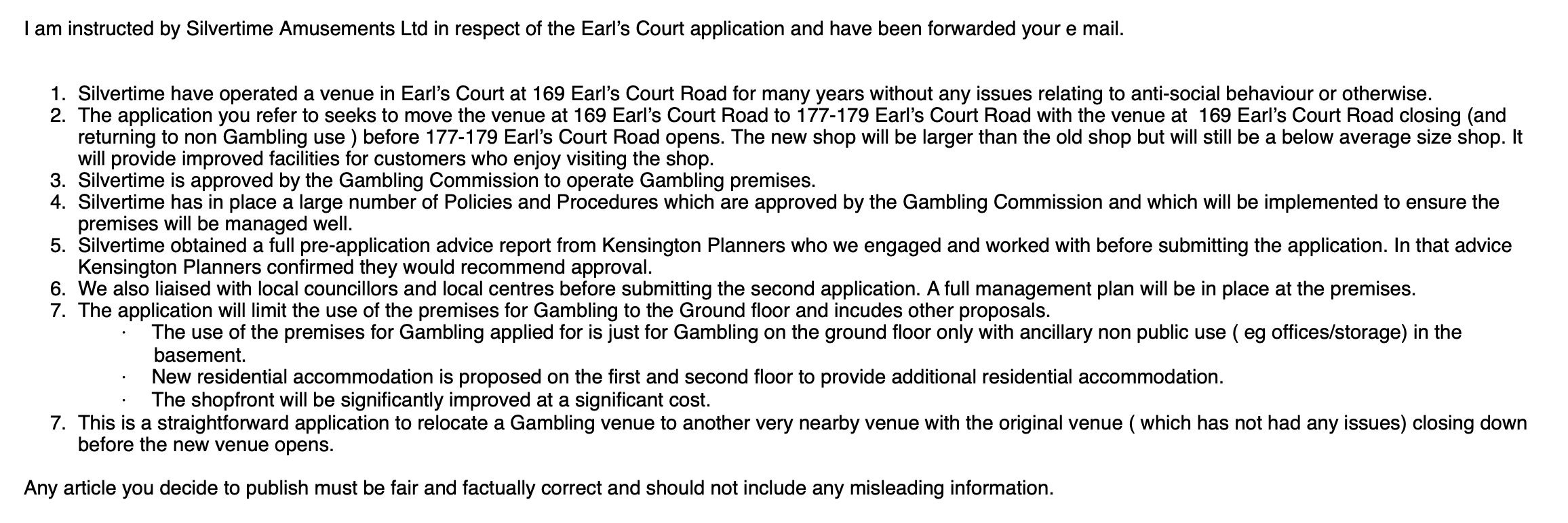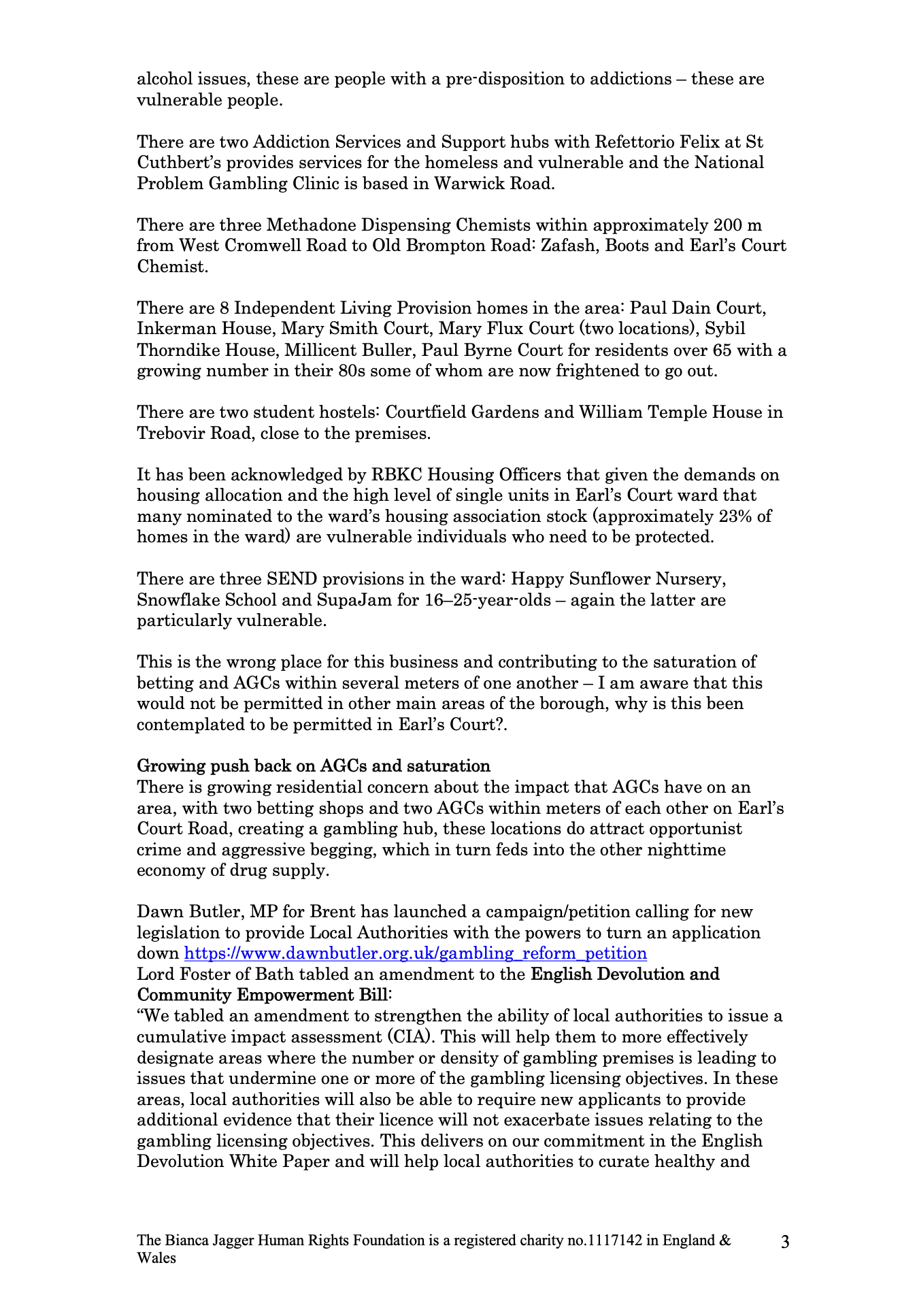 From the letter: ‘This is the wrong place for this business and contributing to the saturation of betting and AGCs within several meters of one another – I am aware that this would not be permitted in other main areas of the borough, why is this been contemplated to be permitted in Earl’s Court?’