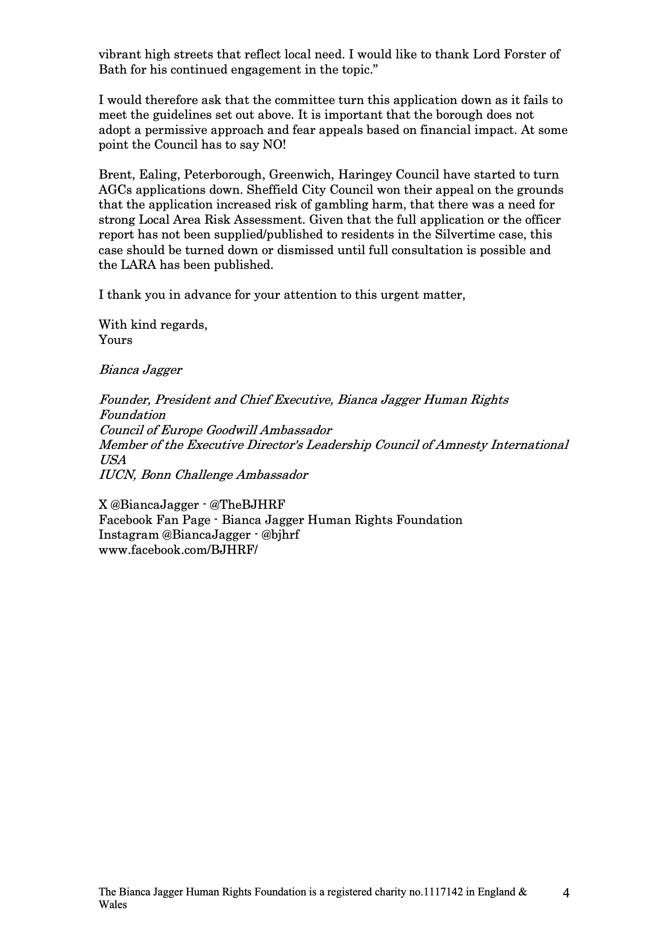 Bianca Jagger’s Objection Letter
