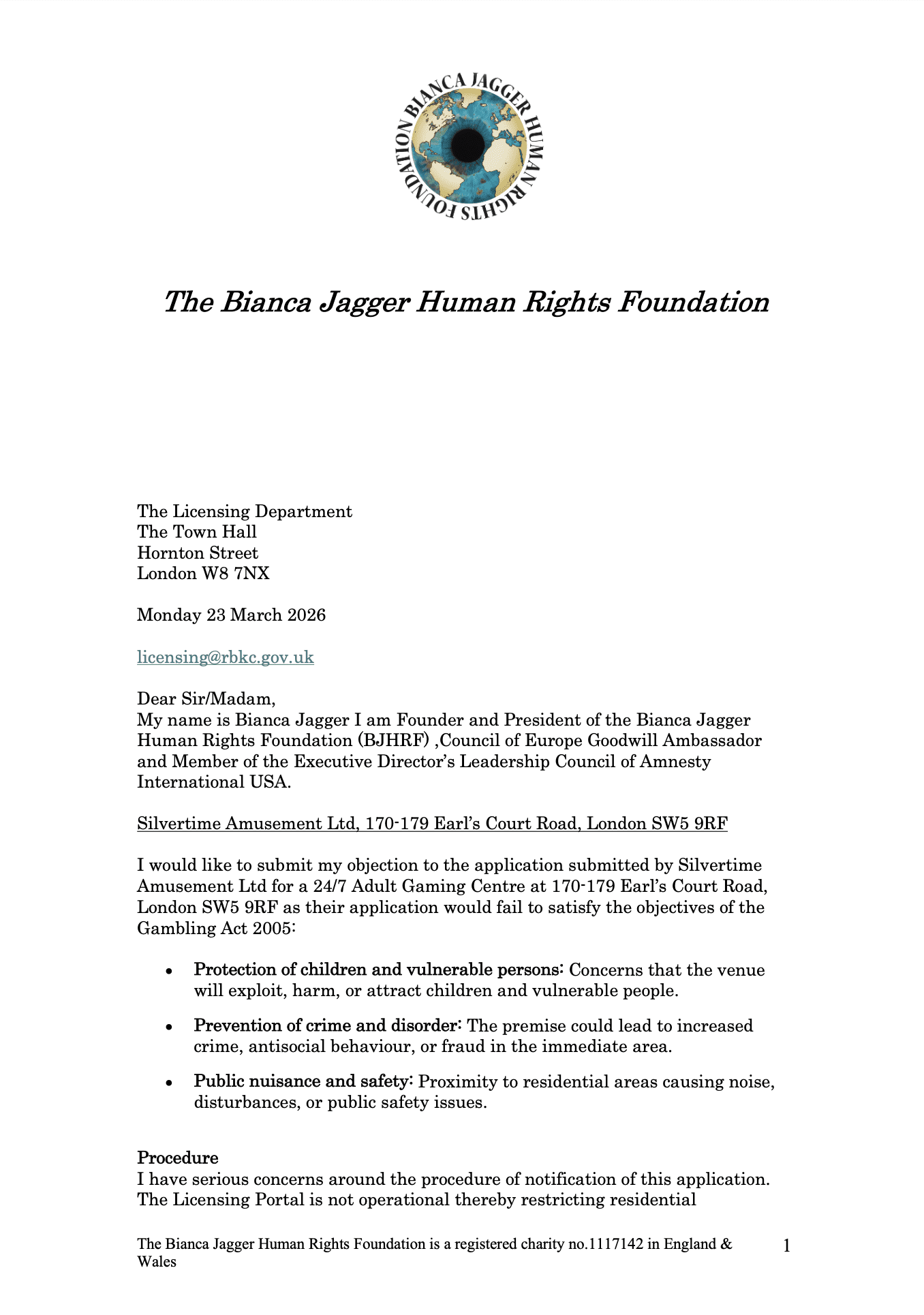 Bianca Jagger’s Objection Letter