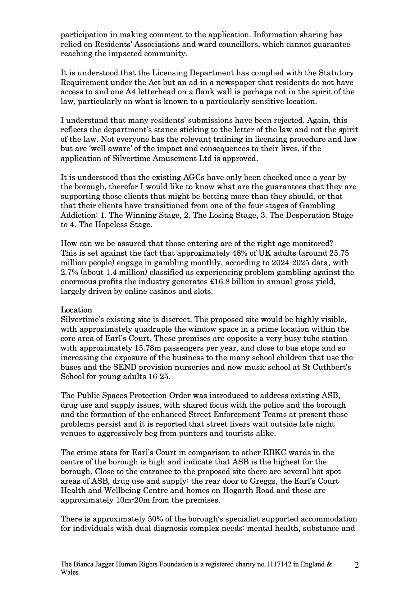 From the letter: ‘This is the wrong place for this business and contributing to the saturation of betting and AGCs within several meters of one another – I am aware that this would not be permitted in other main areas of the borough, why is this been contemplated to be permitted in Earl’s Court?’