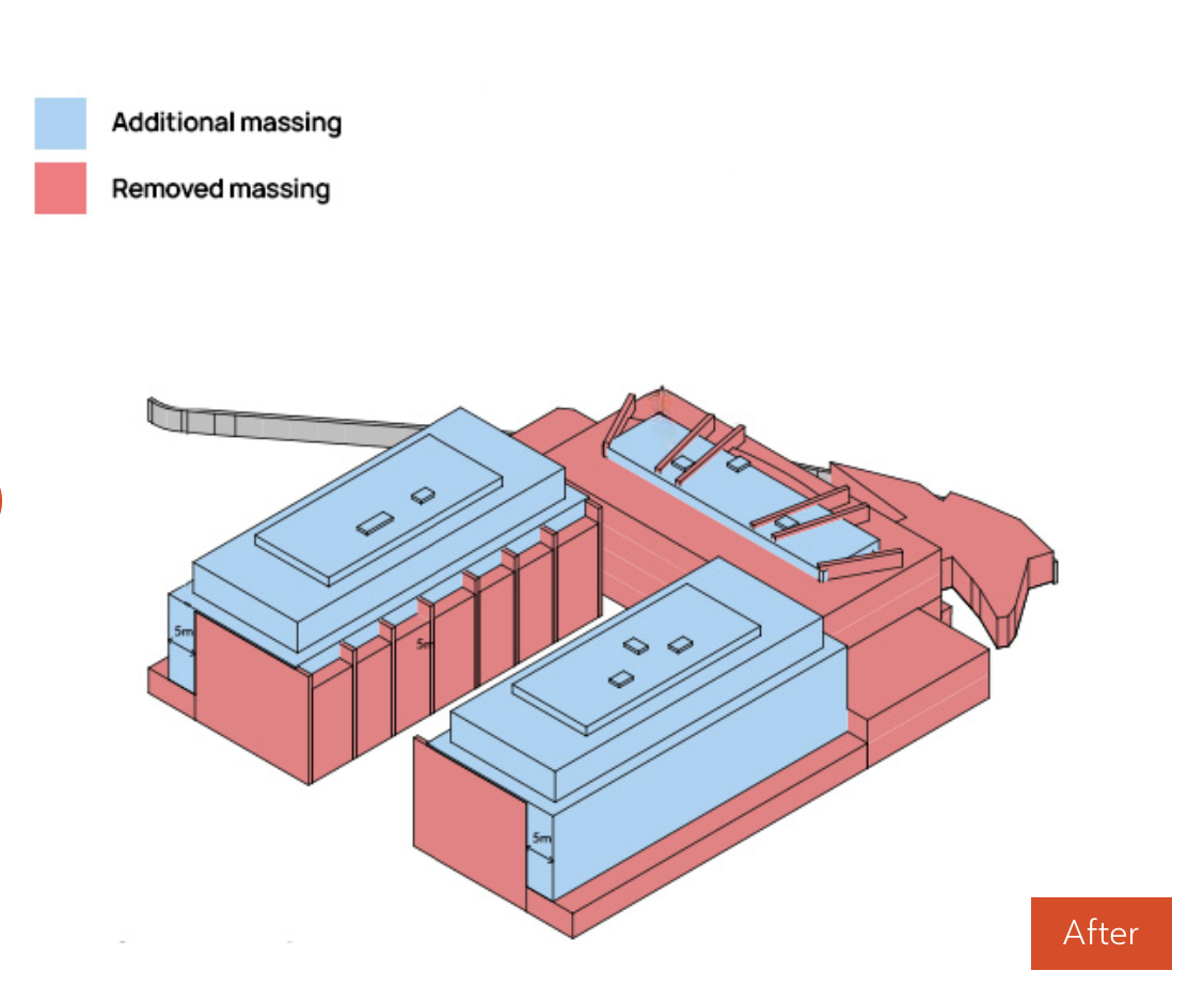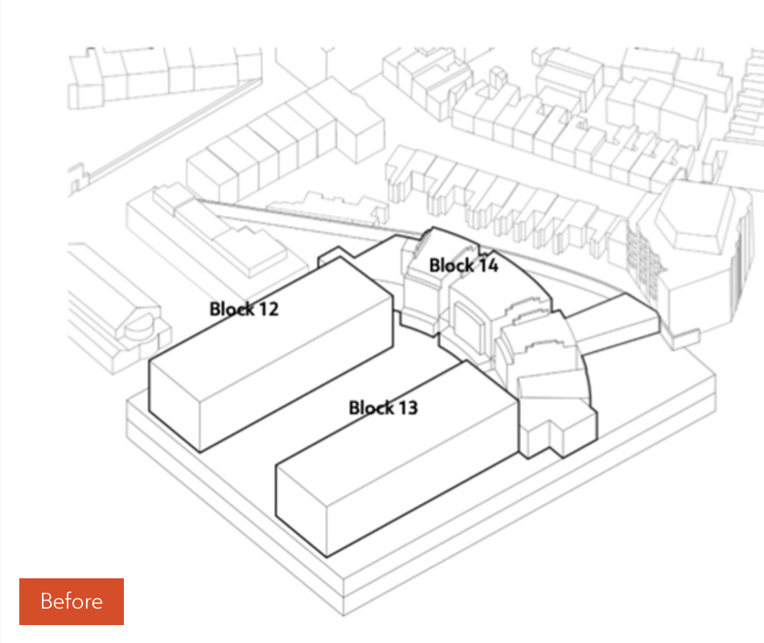 Other key changes will see Building No.14 lose its crescent shape and become rectangular, and the private gardens facing Garrison Square will be removed to improve permeability and street frontage.