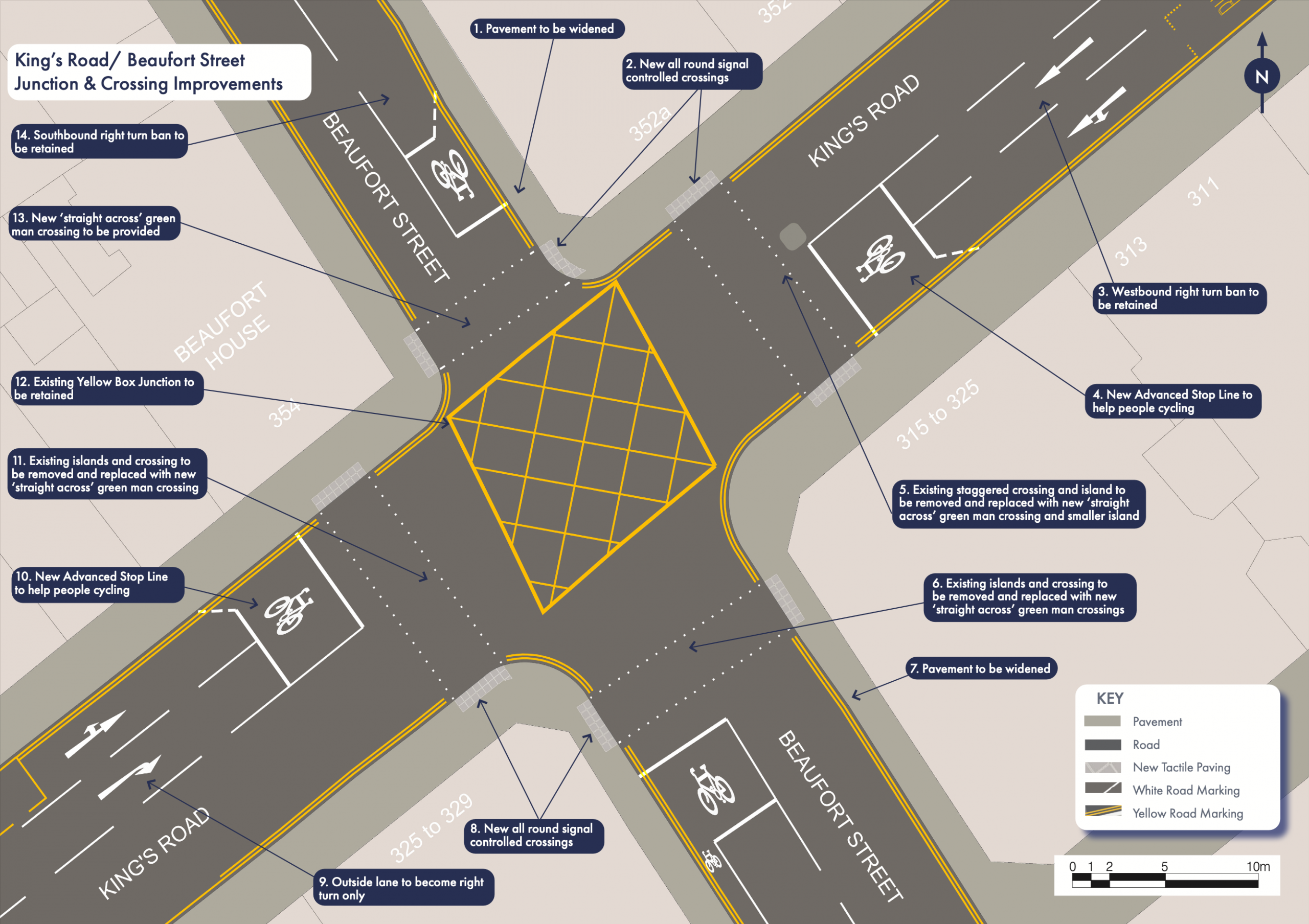 In other changes there, the pavement on the eastern side of Beaufort Street will be widened, and the Council plans to make the outside lane coming from the west on the King’s Road only for drivers turning right into Beaufort Street.