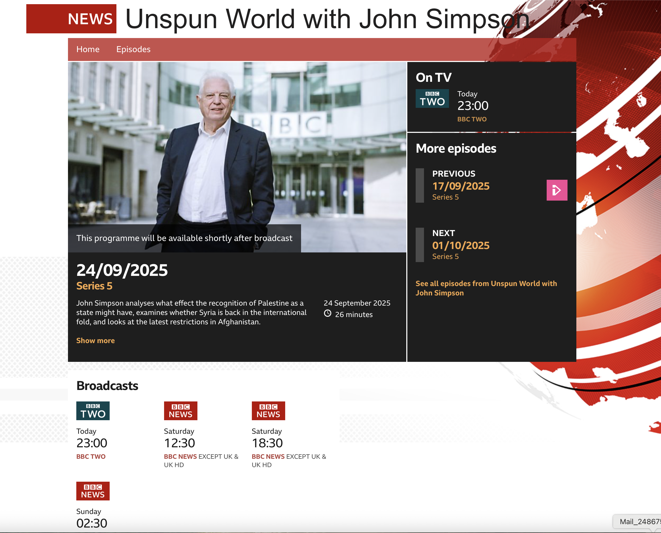Unspun World with John Simpson is broadcast on the BBC at varying times. Scheduling details can be found here. And all episodes can be found on the iPlayer here
