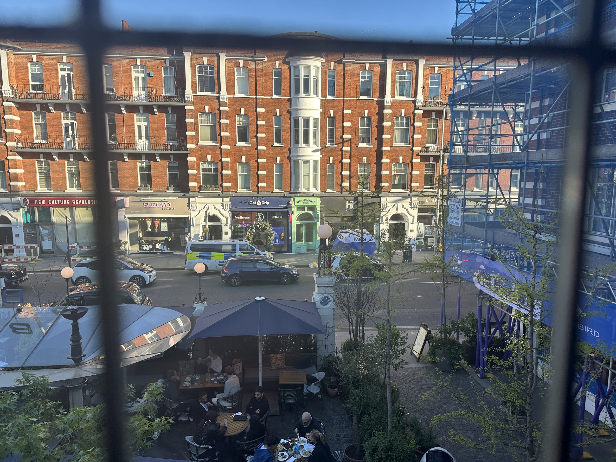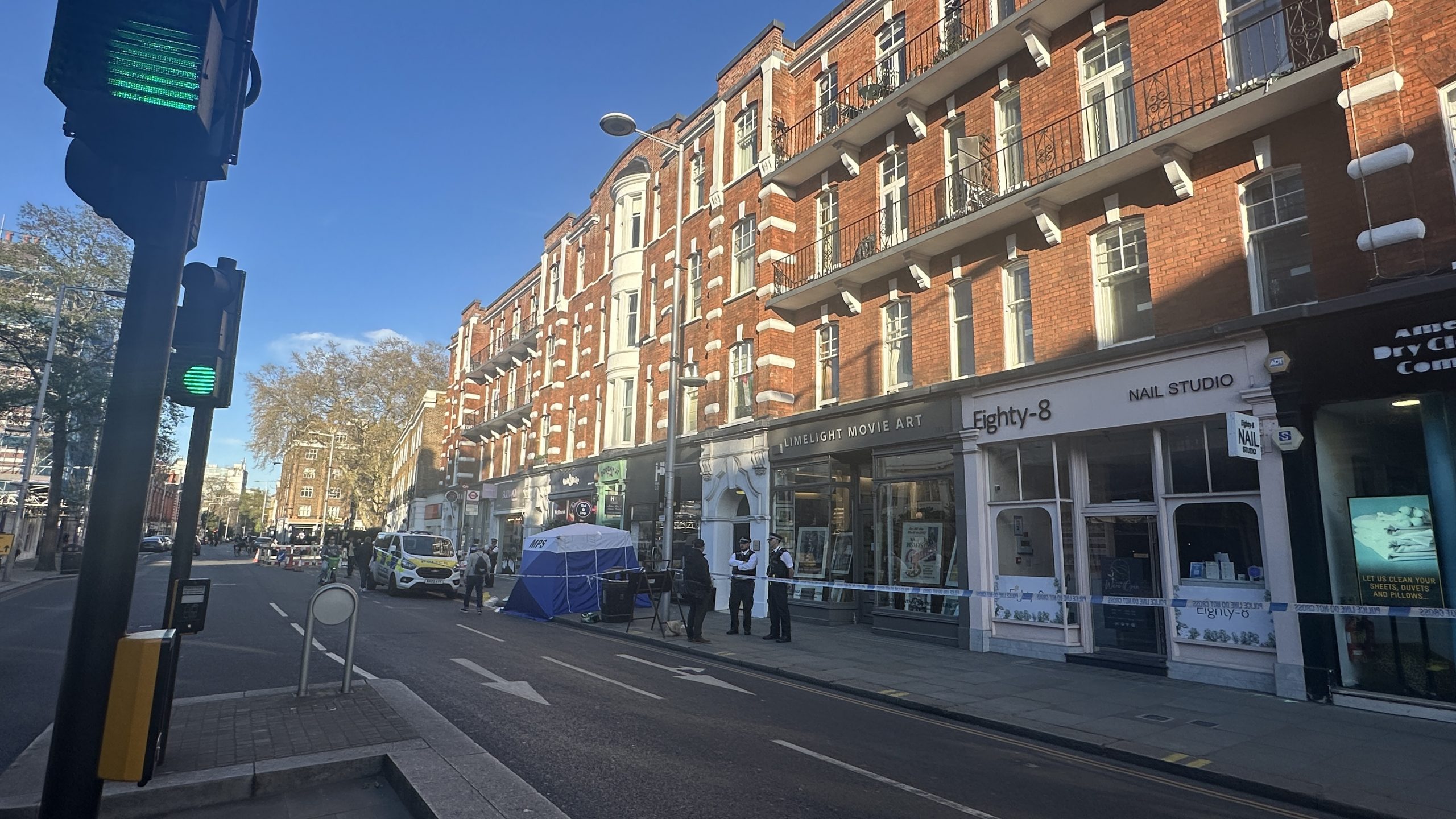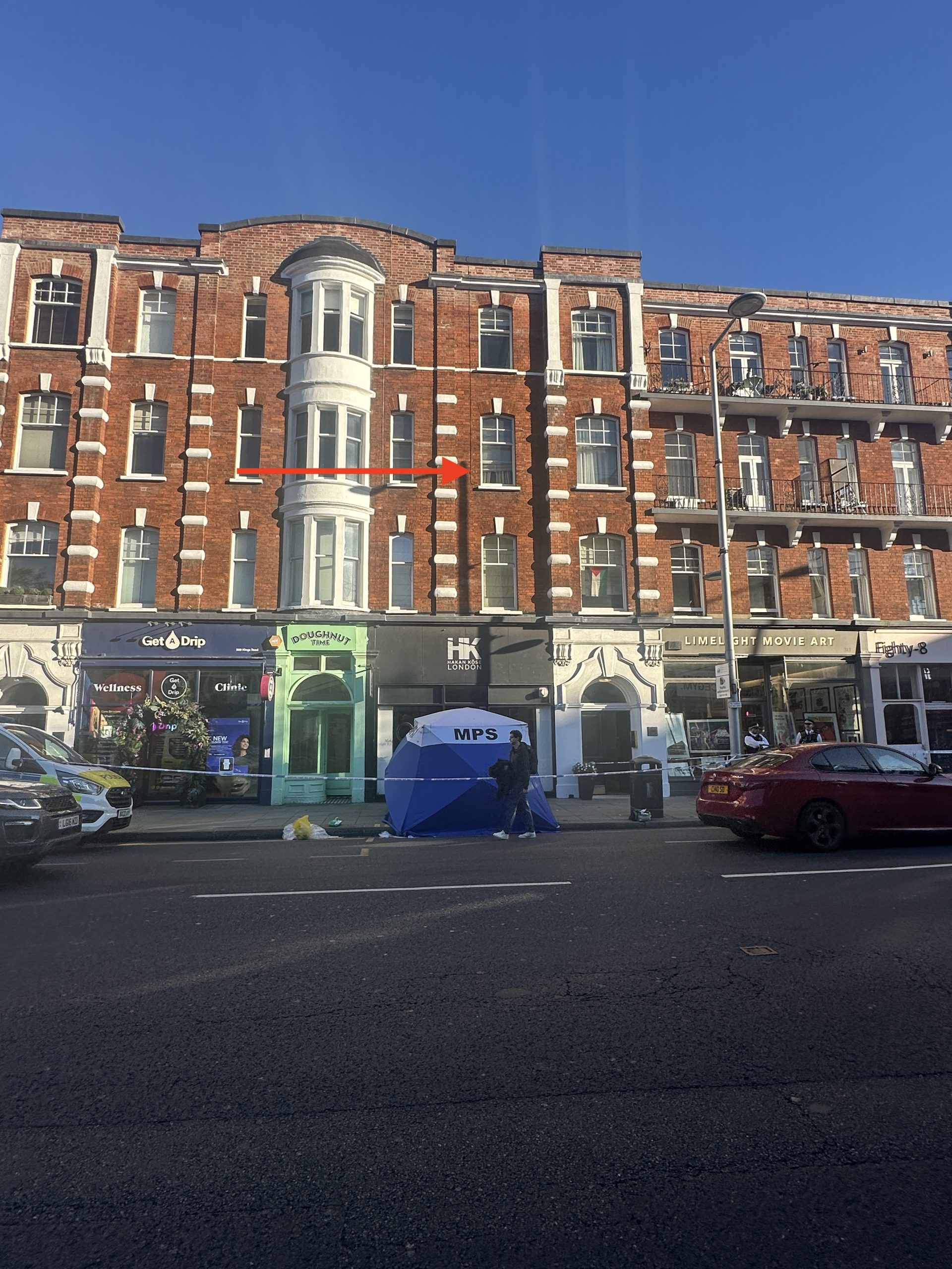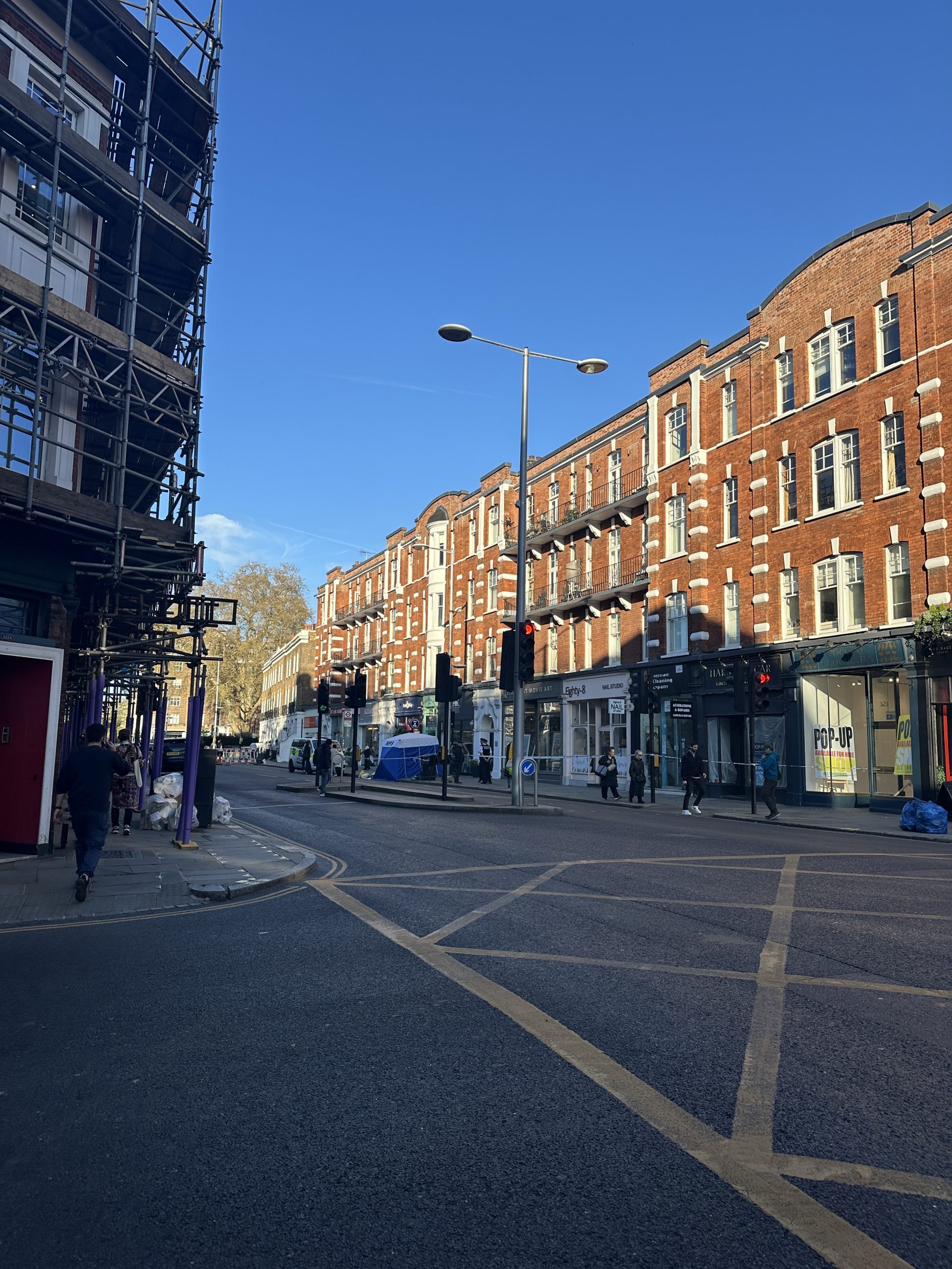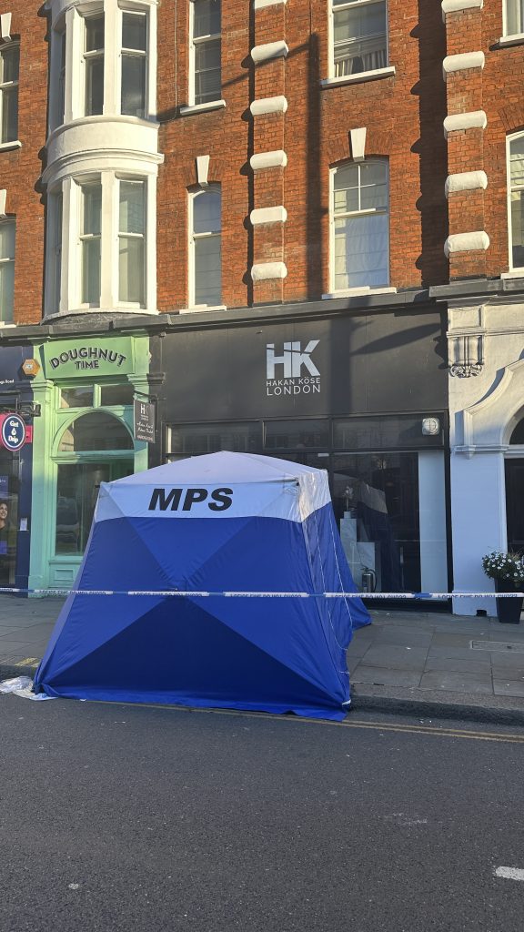 It is believed that he fell from a flat on the second floor of the mansion block building above shops near the junction of the King’s Road with Beaufort Street. A lower section of a sash window could be seen partially opened in one of the flats directly above where the man’s body was found.