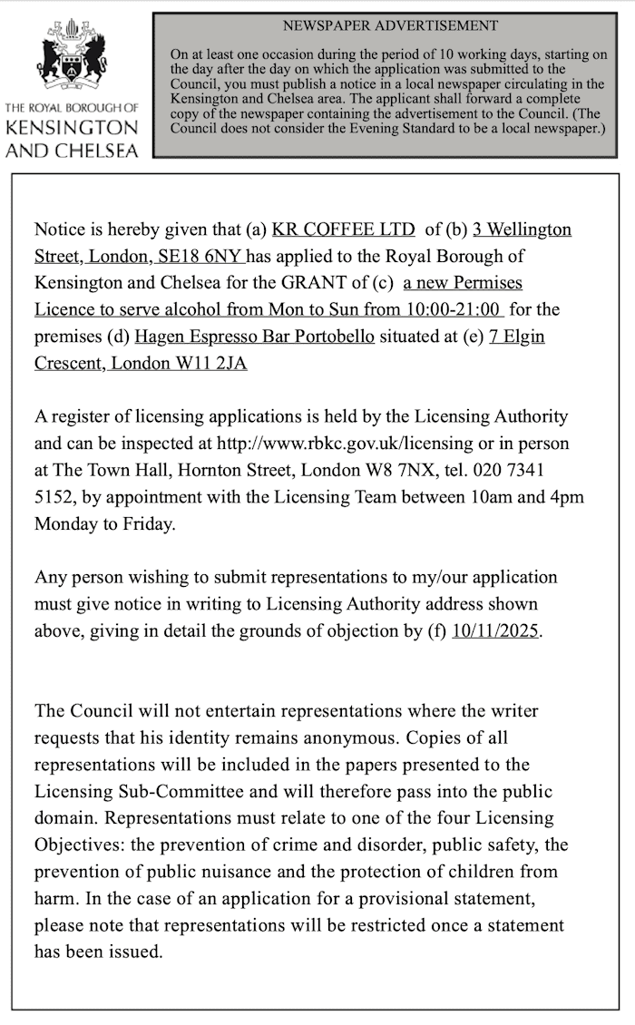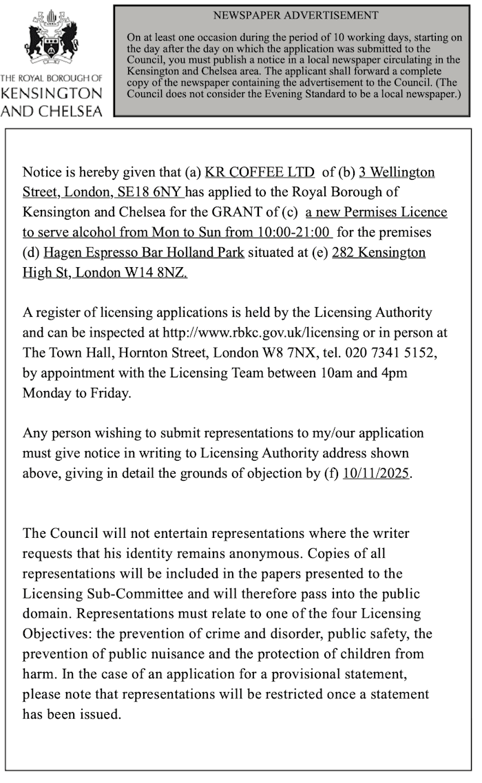 This is a licensing application by Hagen Espresso Bar Holland ParkĀ to serve alcohol from Mon-Sun, 10am-9pm, at the premises atĀ 282 Kensington High St, London W14 8NZ