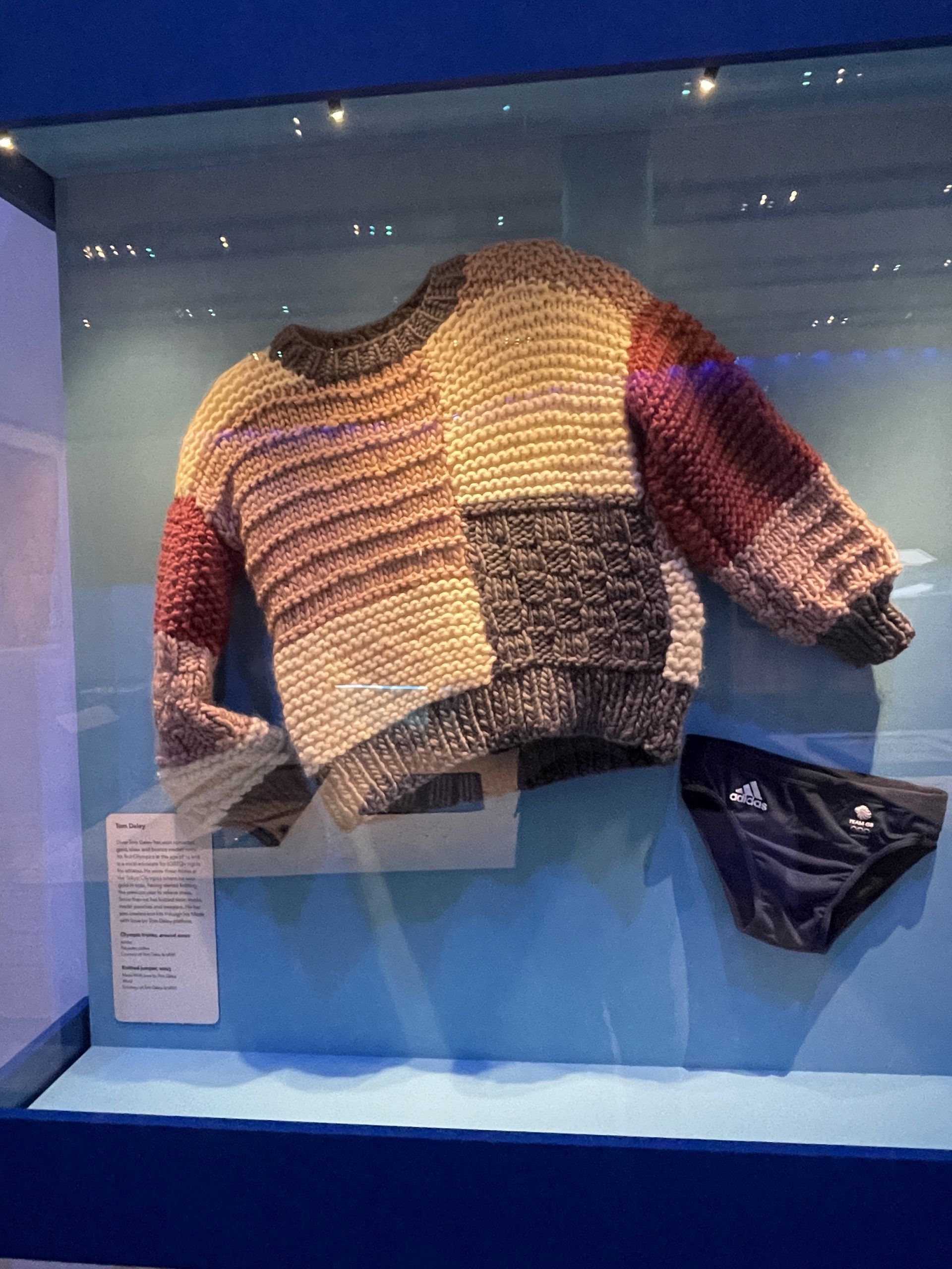 The Splash! exhibition has many exhibits of a more sober nature that tell the story of swimming from the 1920s to the modern day. Among them are the first Olympic solo swimming gold medal won by a British woman – Lucy Morton for the 200m breaststroke title at the 1924 Paris games – and a pair of diver Tom Daley’s Speedos worn while competing at the Tokyo 2020 Olympic Games, plus a jumper he knitted during the tournament.