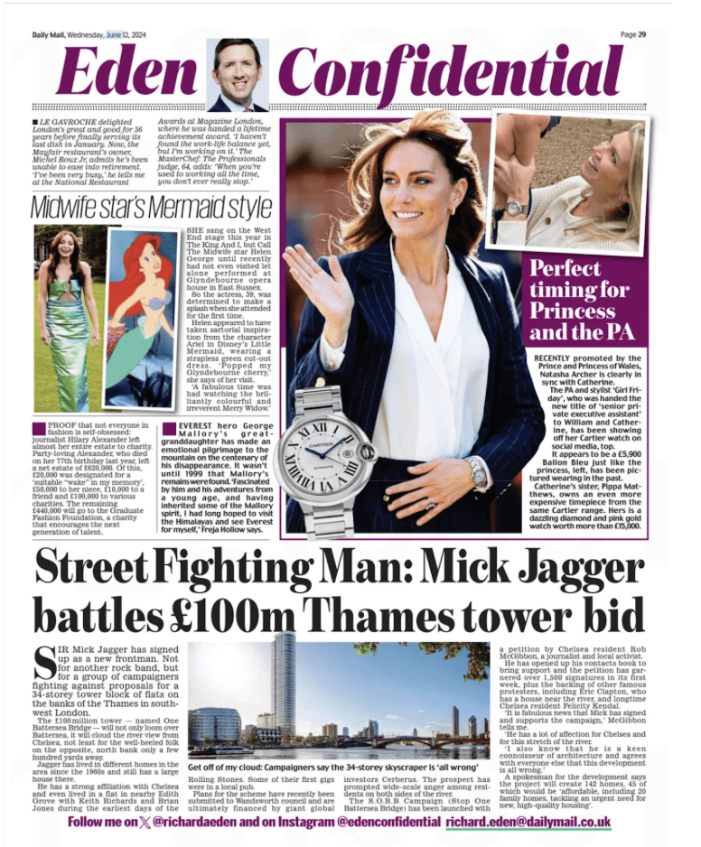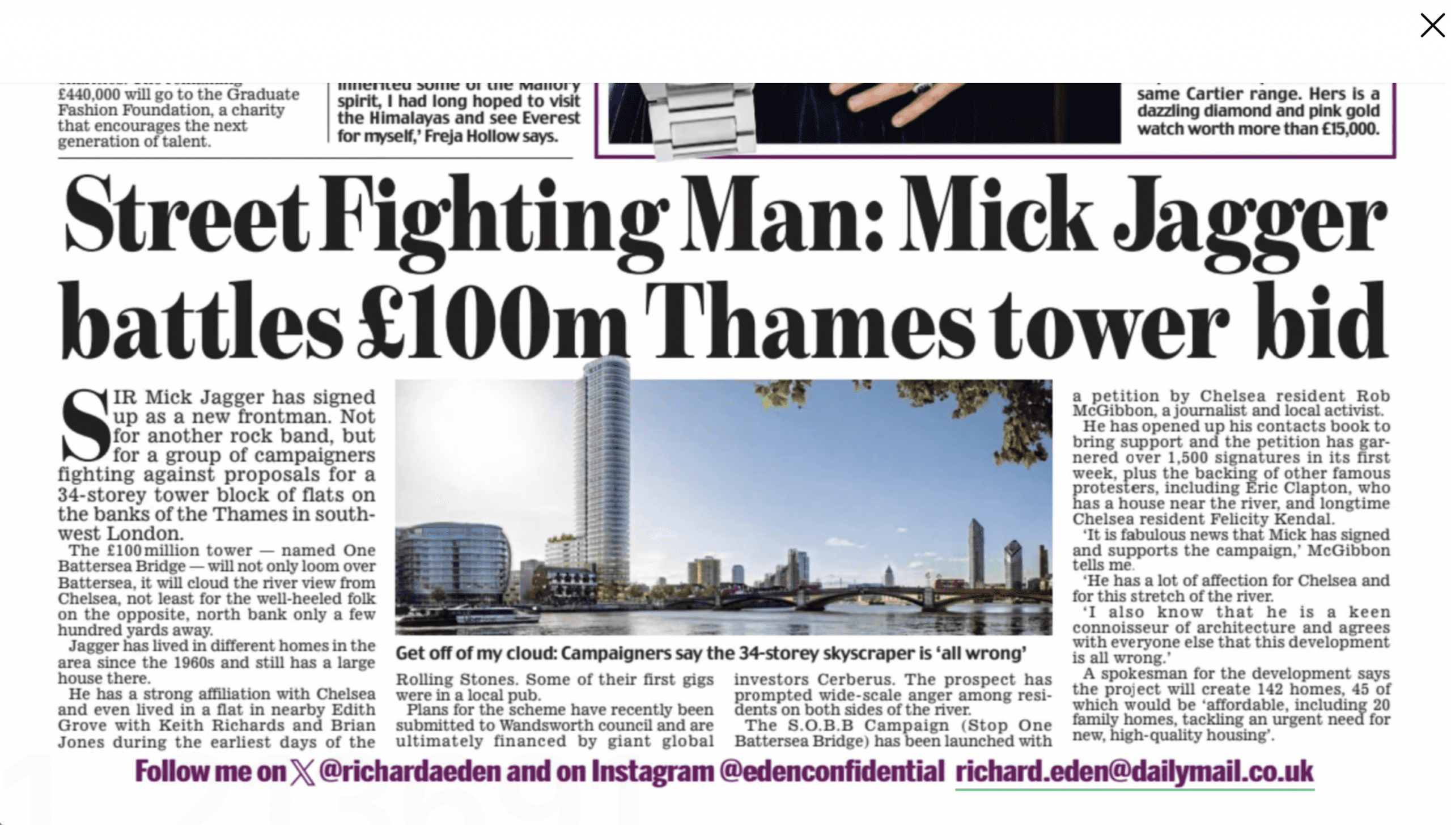 Rolling Stone Mick Jagger joins the band to oppose the “toxic tower” by Rob McGibbon | Jun 12, 2024 | Campaigns Long-time Chelsea resident Sir Mick Jagger lends his considerable support to the S.O.B.B campaign Exclusive story in Richard Eden’s diary column in the Daily Mail