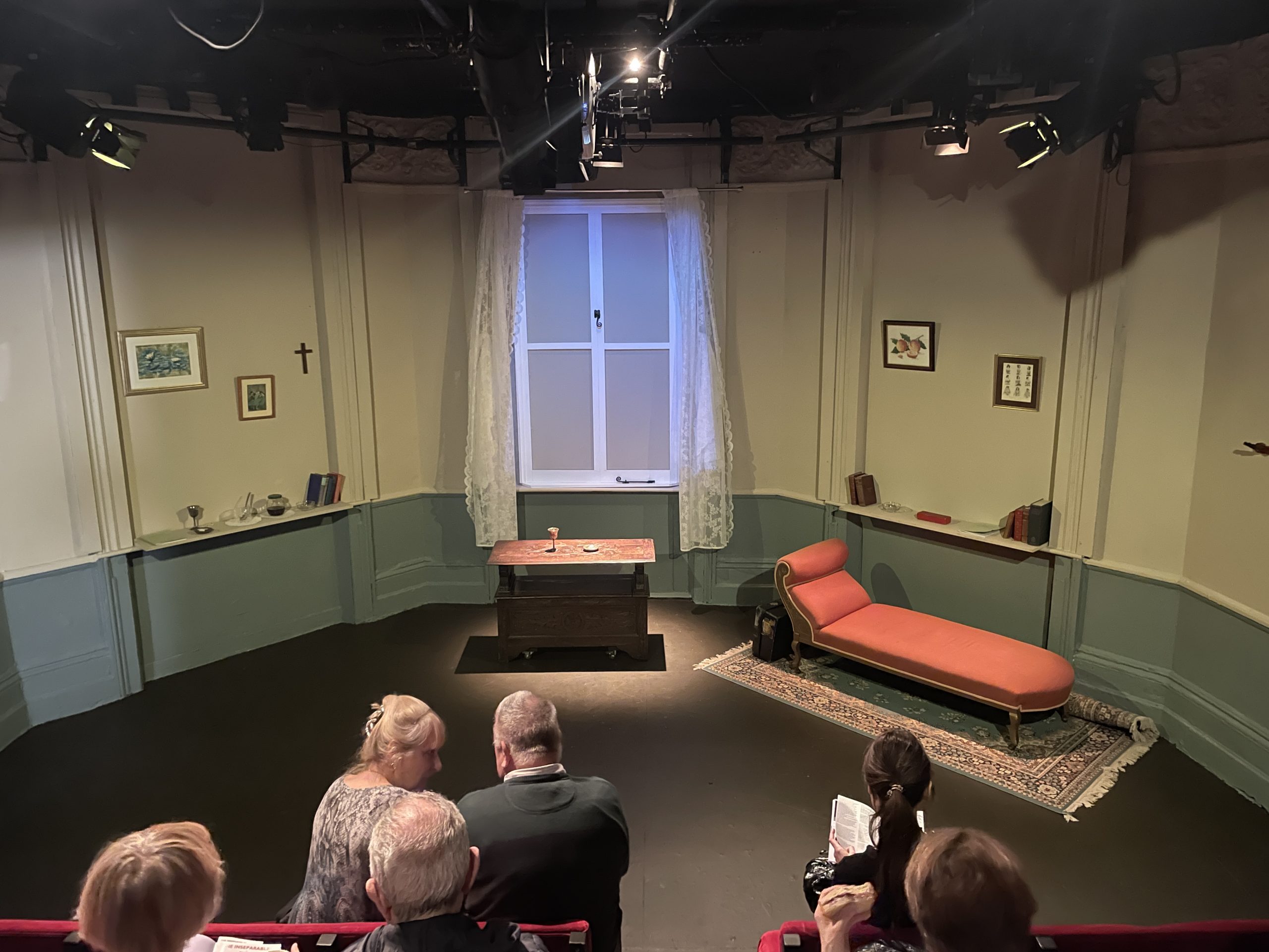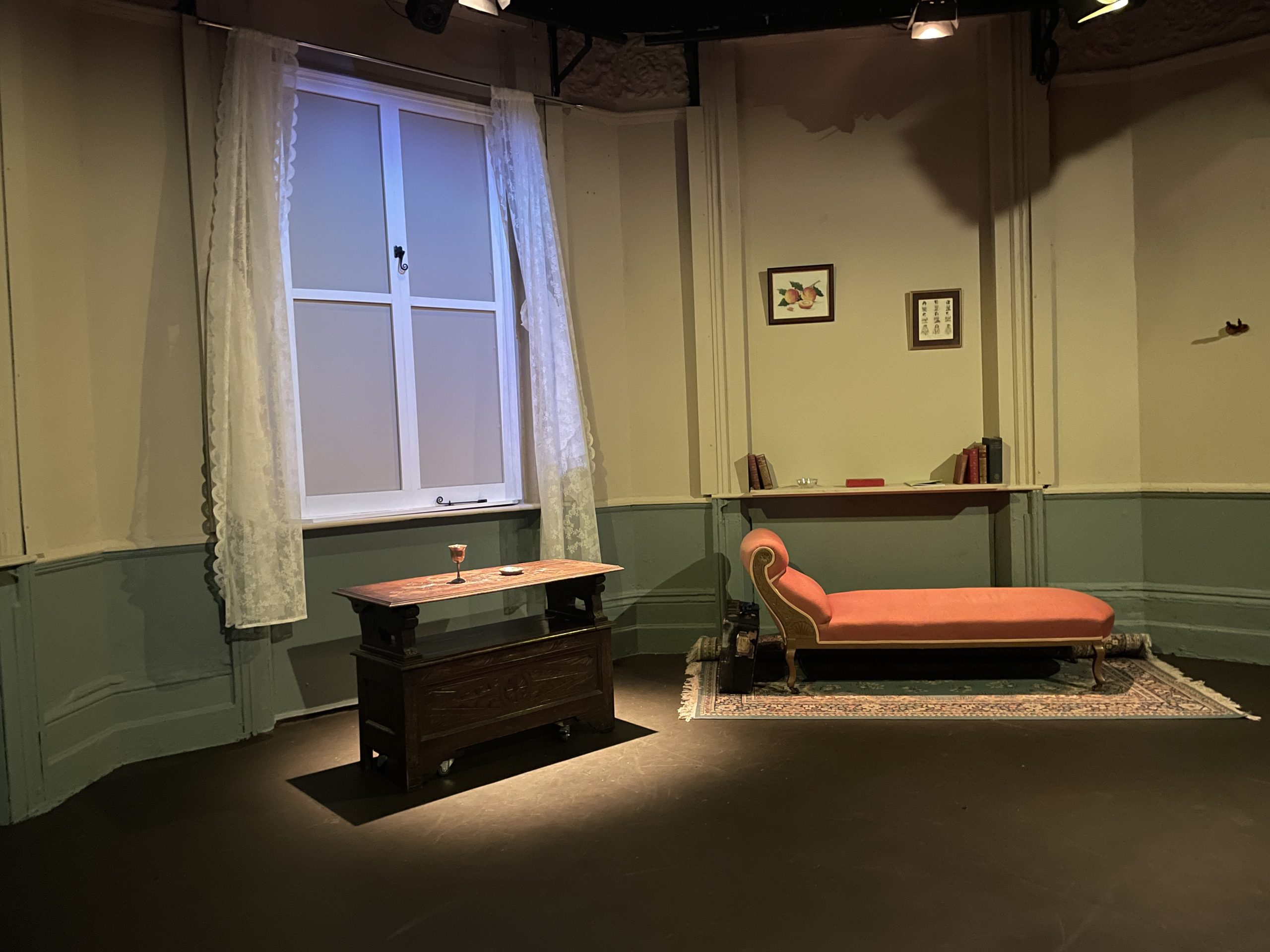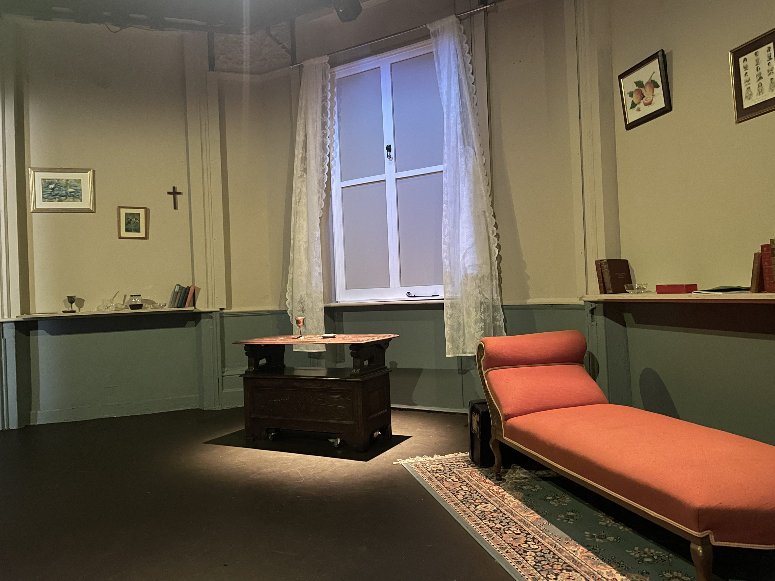 The Set: In reality, the set is simply a sparse room with a table, a pale peach chaise longue, a rug and a large window fringed with lace. A few framed wall pictures and a crucifix adorn the dull walls. Yet, such is the inventiveness of this production and its players that this small space morphs into multiple locations inside your imagination. One minute it is a church at mass, an imposing school, a country home, a train carriage, a meadow for a picnic on a hot summer’s day. It is even the chilly depths of a dark river, or lake.