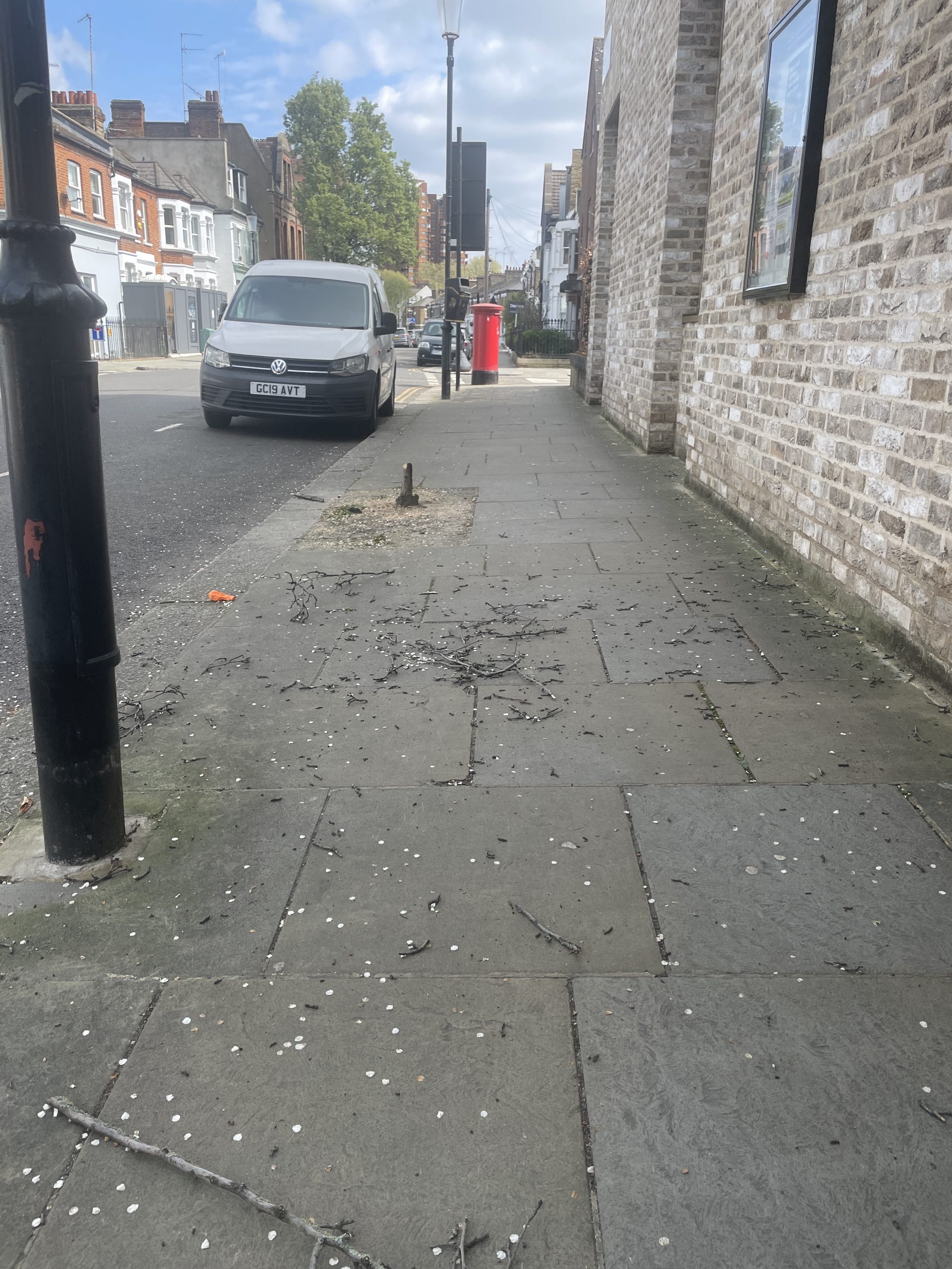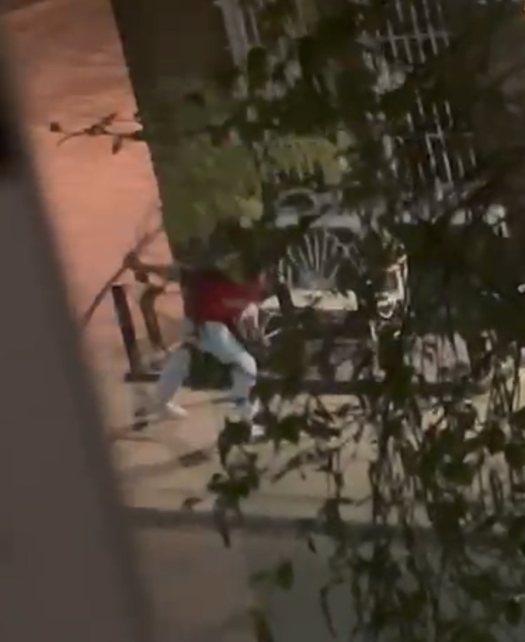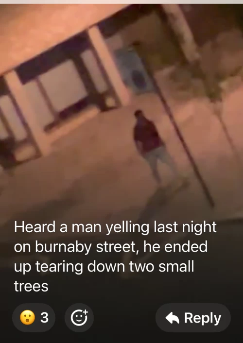 As the dark-haired man walked (staggered?) west by Chelsea Academy school, he suddenly grabbed a sapling tree and yanked it clear of its wooden stake, then hurled it to the ground. He then proceeded to do the same to a second tree. Both trees were destroyed and later found discarded by the road.
